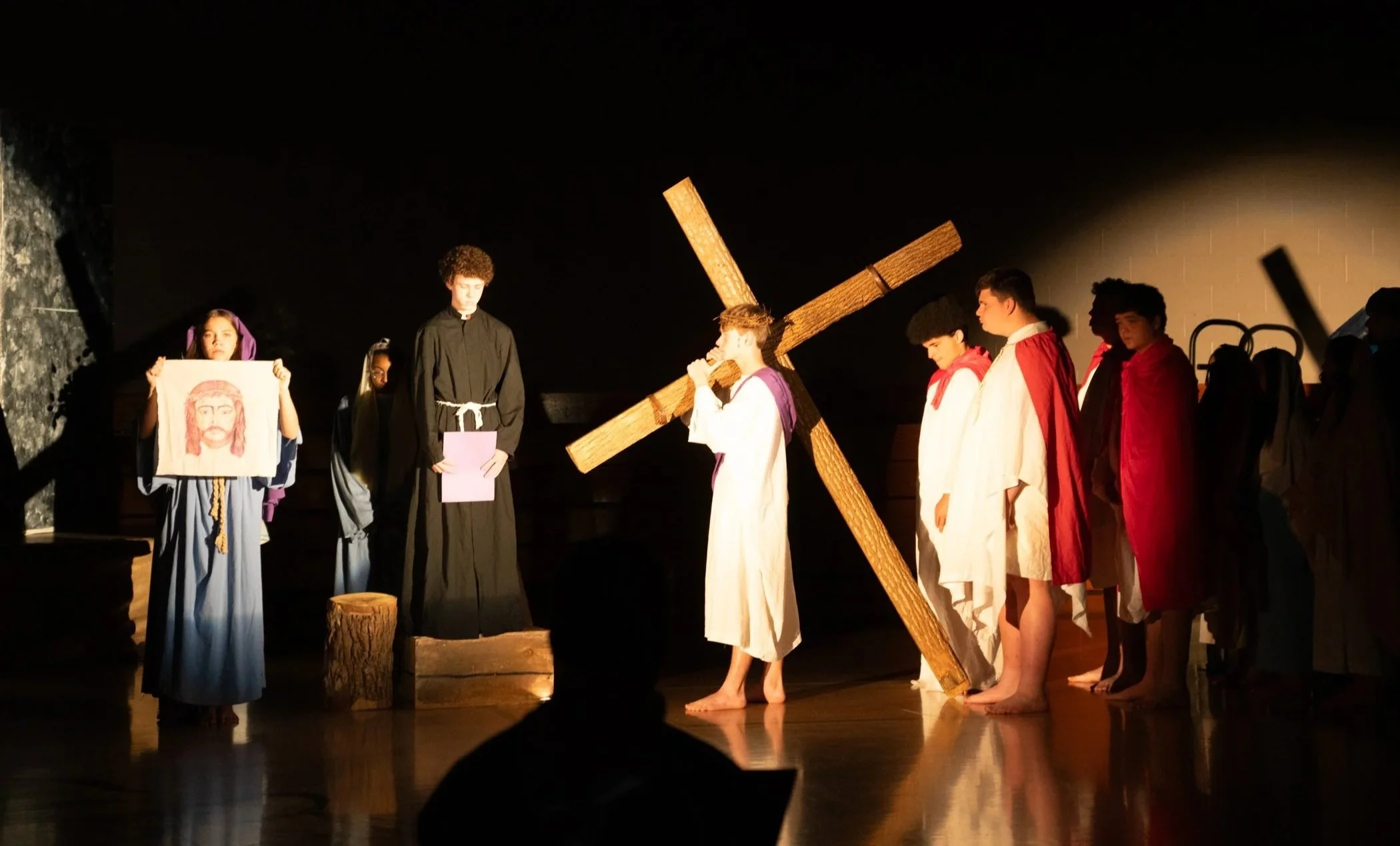 The eighth grade students present a Passion Play each year for the school community during Lent.