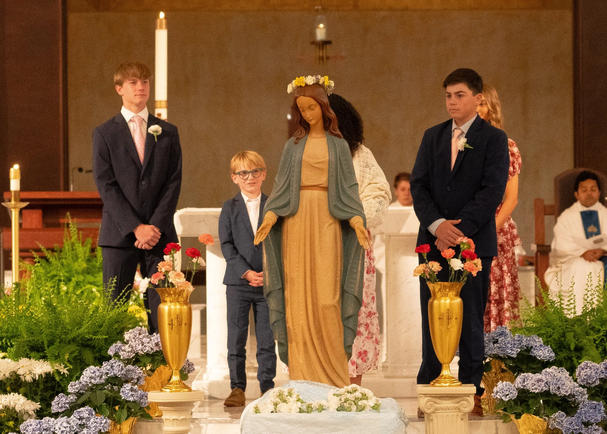 May Crowning is a Mass dedicated to Mary and is a special occasion for the eighth and second grade students, who process during the Mass, form an honor guard, and crown the statue of Mary.